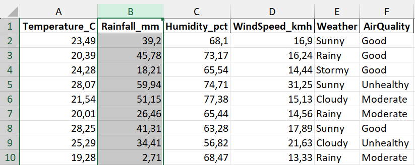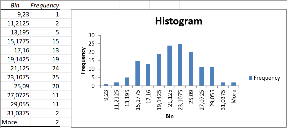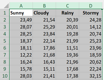 In the climate dataset, the mean temperature is 20,62, while the standard deviation is 4,75. The mean rainfall is 19,62, while its standard deviation is 14,9. It seems that the standard deviation of the temperature is relatively small compared to the mean, whereas the mean and standard deviation of the rainfall are similar. But this is just based on our intuition about the values.