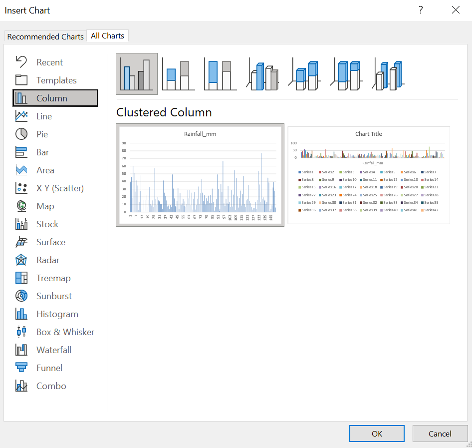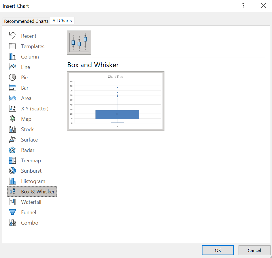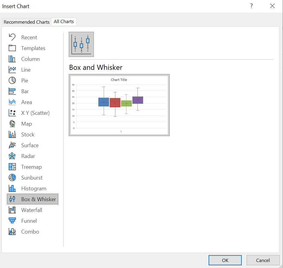To create side-by-side boxplots, first select the data. Then, as before, navigate to Insert \(\rightarrow\) Recommended Charts \(\rightarrow\) All Charts \(\rightarrow\) Box & Whisker.