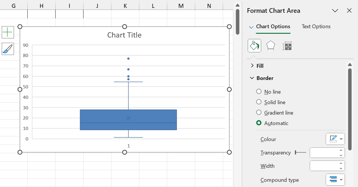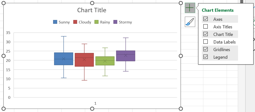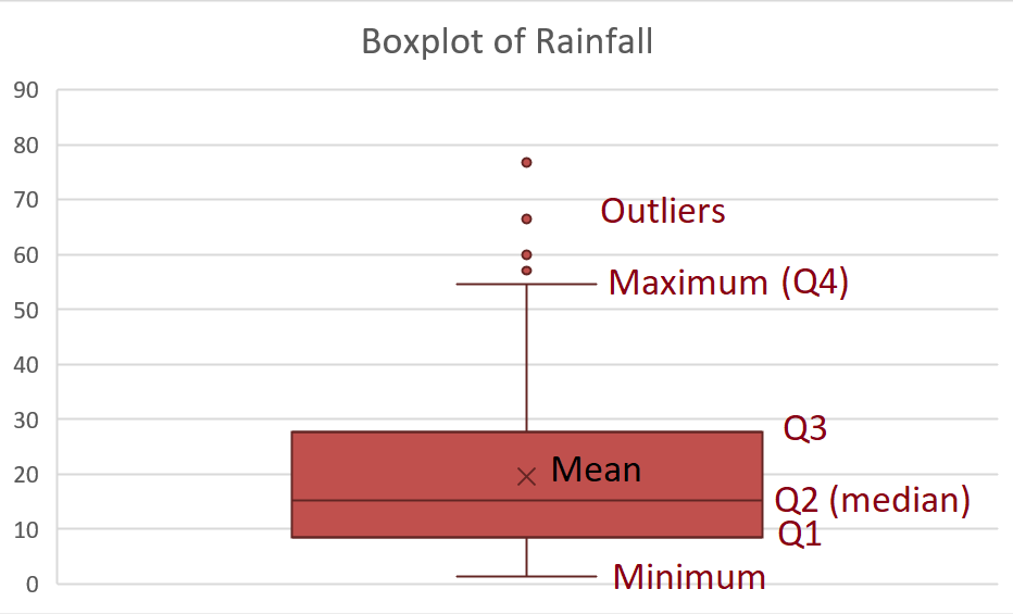 Excel also prints the mean on the boxplot, represented by \(\times\).