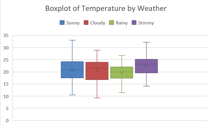 Boxplots can also be drawn side-by-side to compare groups of data. This is most useful if it is comparable data groubed into categories. For example, boxplots may not be particularly useful when comparing rainfall and temperature. However, grouped temperature data could be compared this way. Below, we have grouped the temperature according to the weather.