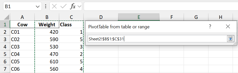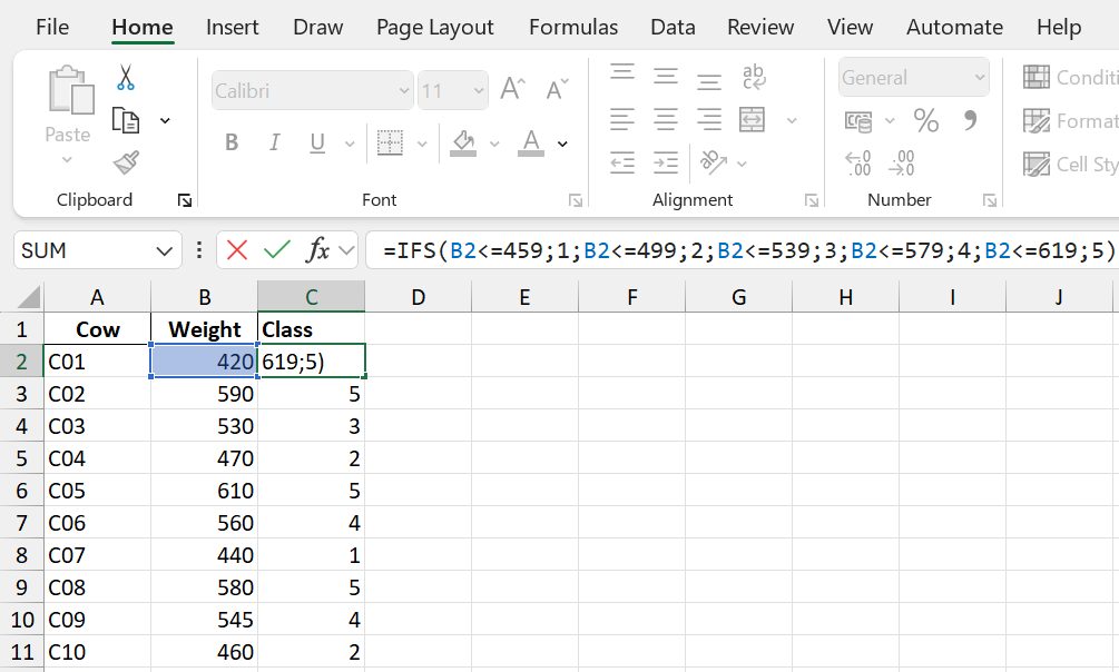 \[\textrm{Class width } = \frac{\textrm{range of values}}{\textrm{number of classes}}=\frac{\textrm{max value} - \textrm{min value}}{\textrm{number of classes}}.\] Suppose Rethabile wants to summarise the weights of her cows. To create a frequency distribution table, she first needs to decide on classes. For small datasets, such as this one, 5 classes should be sufficient.
