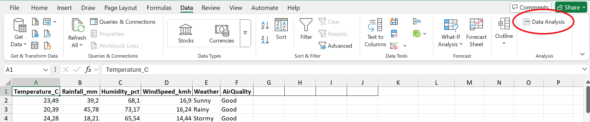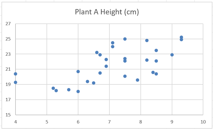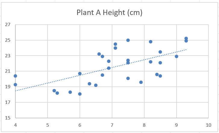 \[\textrm{Correlation coefficient between }X\textrm{ and }Y= \textrm{CORREL(range of }X,\textrm{range of }Y).\] To obtain the correlation between temperature and rainfall, for instance, we would use the following syntax: