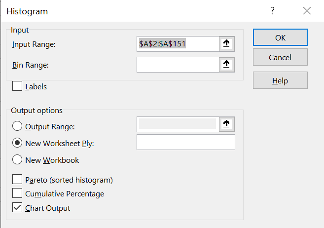 \[=\textrm{CORREL(A1:A151,B1:B151}),\] and obtain a value of approximately -0,05.
