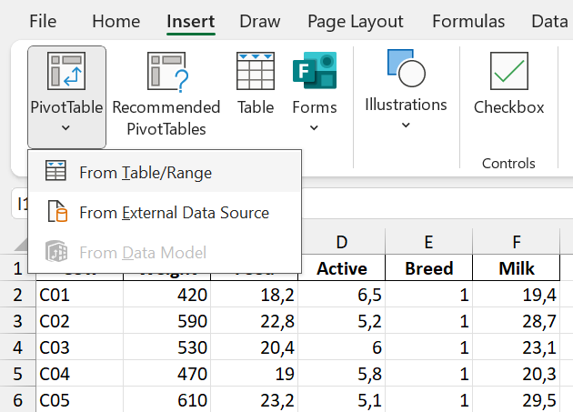 Step 1: Go to the Insert tab, click on PivotTable, and select the “From Table/Range” option.