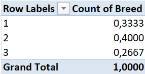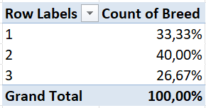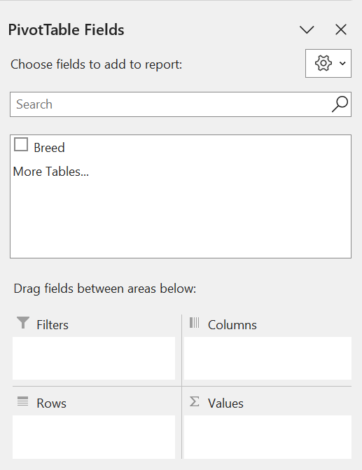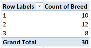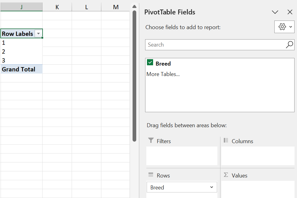 Step 3: Drag the Breed variable into the Rows area. This will create a table on your spreadsheet with the Breed categories.