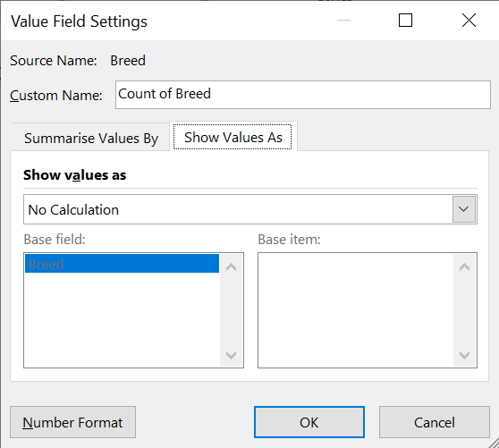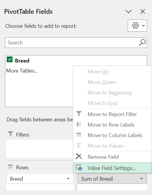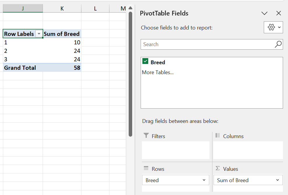 Step 4: Also drag Breed into the Values area. By default, Excel will calculate the Sum of the variable.