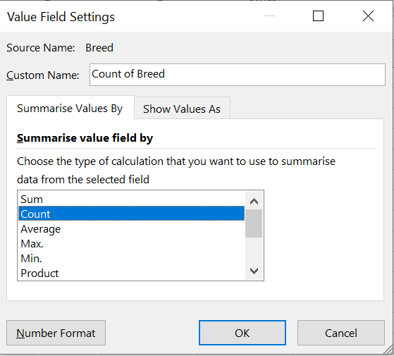 Step 6: Select the “Count” option. We want to count the number of times each breed occurs.