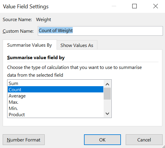Step 9 (Relative frequency distribution): Click on “Number Format” in the Value Field Setings table.