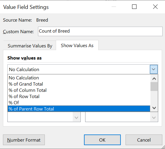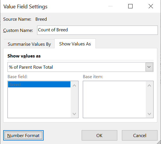 Step 8 (Percentage frequency distribution): Select “% of Parent Row Total” and click OK.